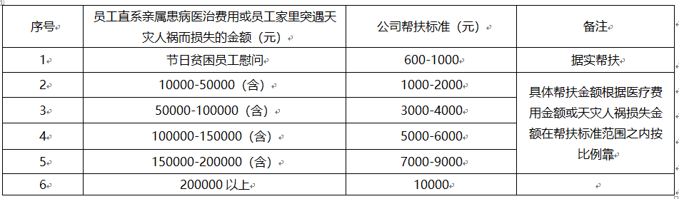 员工的直系亲属(指父母、配偶、子女)患重大或长期疾病、伤亡、突发或遇到天灾人祸等,员工本人的经济承受能力确有困难的,可以向公司申请资助。帮扶标准原则如下: